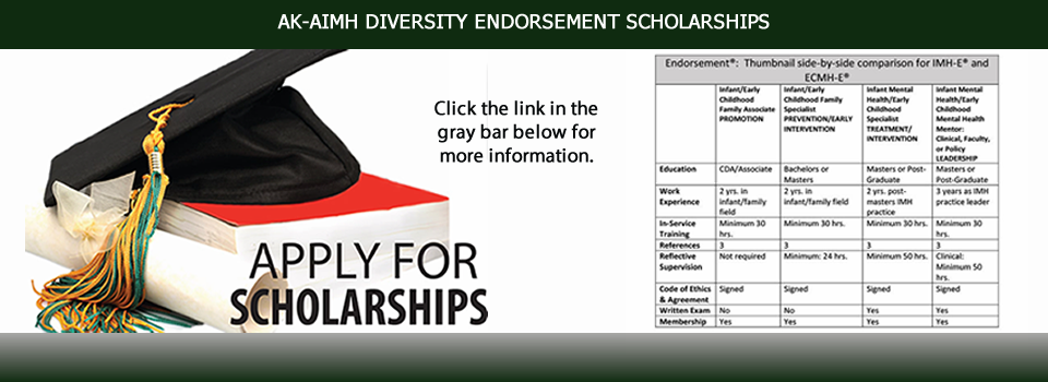 The AK-AIMH Diversity Endorsement Scholarship provides individuals of culturally marginalized or disenfranchised groups with the opportunity to obtain Endorsement in Infant Mental Health or Early Childhood Mental Health.